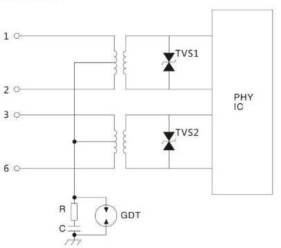1 本方案采用GDT在變壓器前端做共模(八線)浪涌保護(hù)。